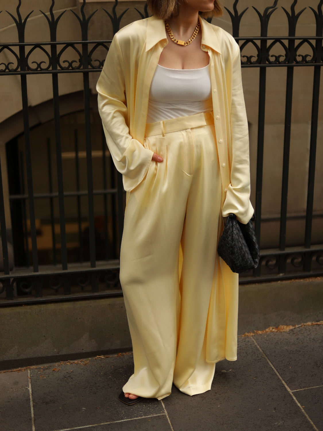 Effortless dressing starts here. The Wrap Shirt Dress ($399) pairs seamlessly with our Wide Leg Trousers ($299) for a look that works from desk to dinner.
